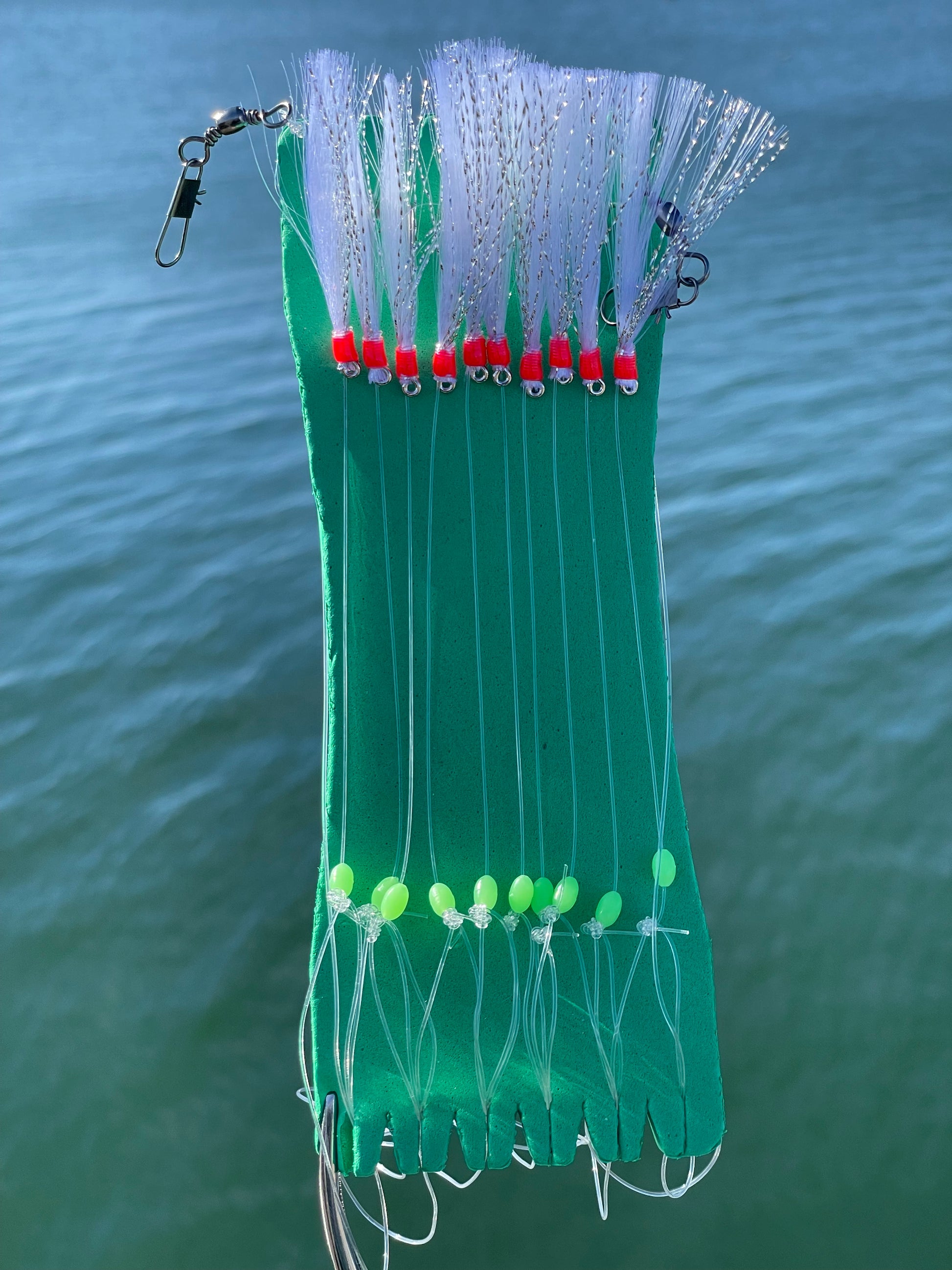 Makrill tackel, fiskekrok, bete linje, fjädrar förvaringsbräda